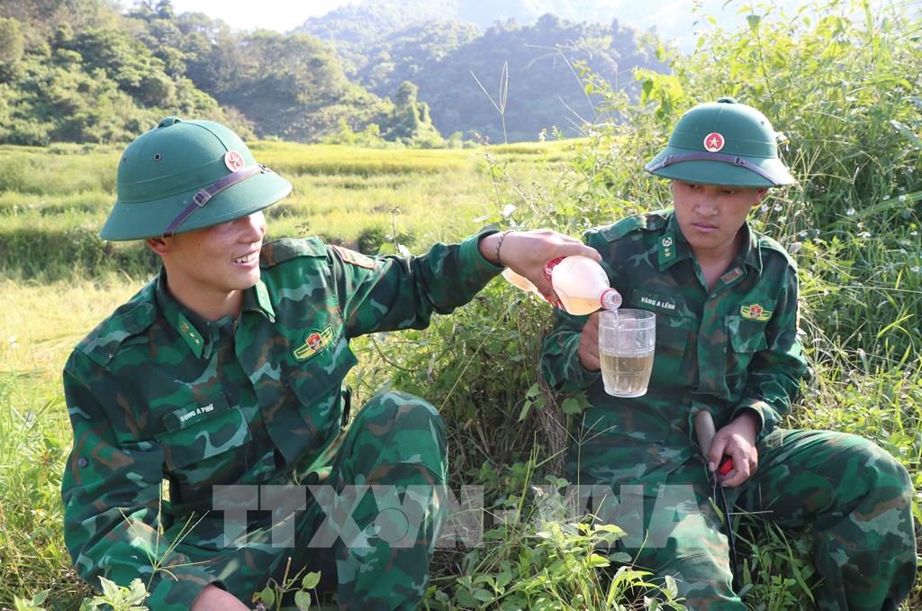 Giờ giải lao của chiến sĩ biên phòng và người dân diễn ra ngay trên những bờ ruộng bậc thang, nơi có nhiều gió mát. Ảnh: Xuân Tiến – TTXVN