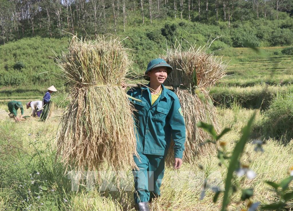 Cán bộ, chiến sĩ biên phòng Đồn Biên phòng Mường Pồn (Bộ đội Biên phòng tỉnh Điện Biên) giúp dân gánh những bó lúa rời khỏi thung lũng. Ảnh: Xuân Tiến – TTXVN