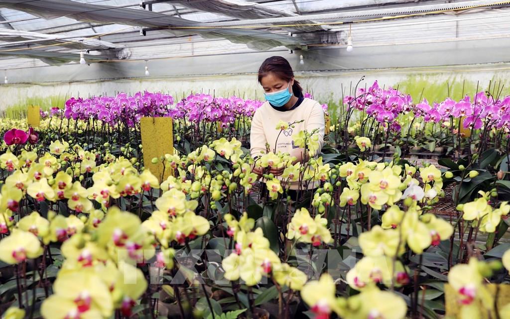 Nhiều chủ vườn lan Hồ Điệp ở Việt trì, Phú Thọ tất bật chăm sóc, cắt tỉa và cắm bình sẵn sàng phục vụ người dân đến mua sắm Tết. Ảnh: Tạ Toàn - TTXVN