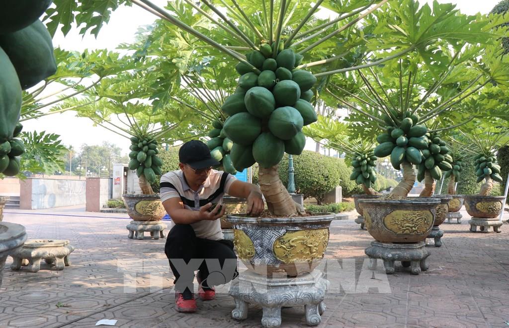 Nông dân Bắc Ninh chăm sóc cây đu đủ cảnh phục vụ nhu cầu trang trí Tết. Ảnh: Thanh Thương - TTXVN