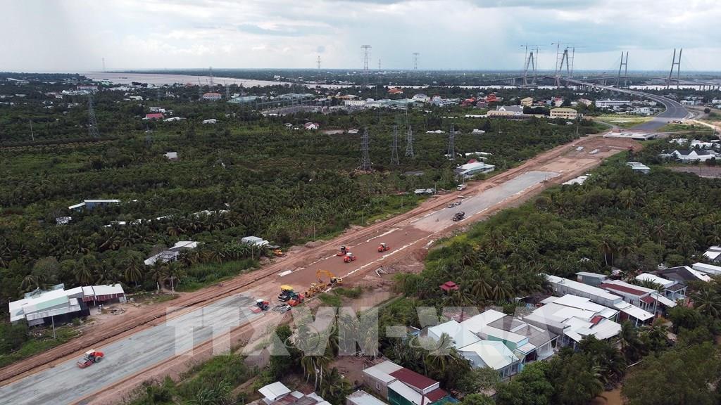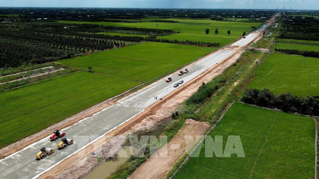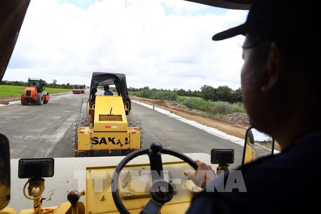 Thi công trên tuyến cao tốc Mỹ Thuận - Cần Thơ dài 23km, đi qua 2 tỉnh Vĩnh Long và Đồng Tháp. Ảnh: Huy Hùng - TTXVN