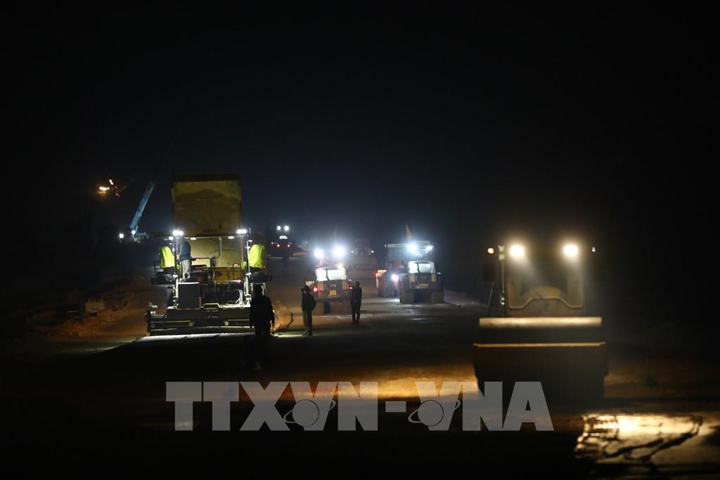 Thi công xuyên đêm trên tuyến cao tốc Mai Sơn - Quốc lộ 45 dài 63km để đưa tuyến đường vào khai thác từ tháng 4/2023. Ảnh: Huy Hùng - TTXVN