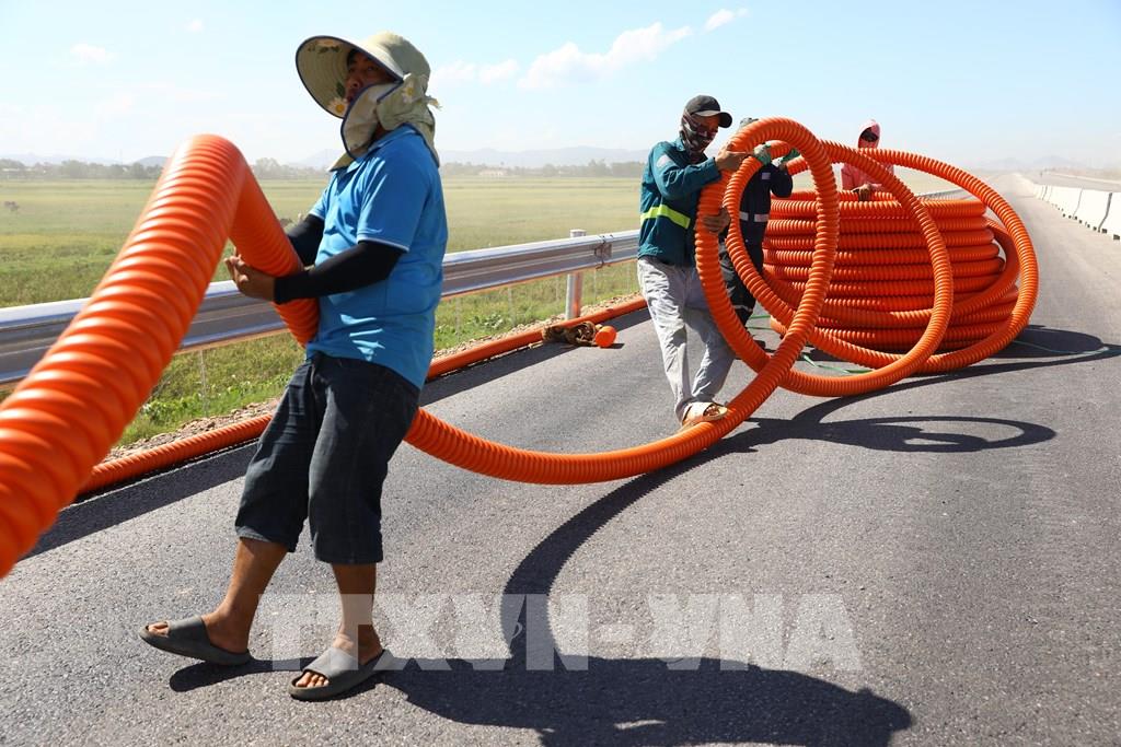 Thi công kéo dây kỹ thuật trên tuyến cao tốc Quốc lộ 45 - Nghi Sơn. Ảnh: Huy Hùng - TTXVN