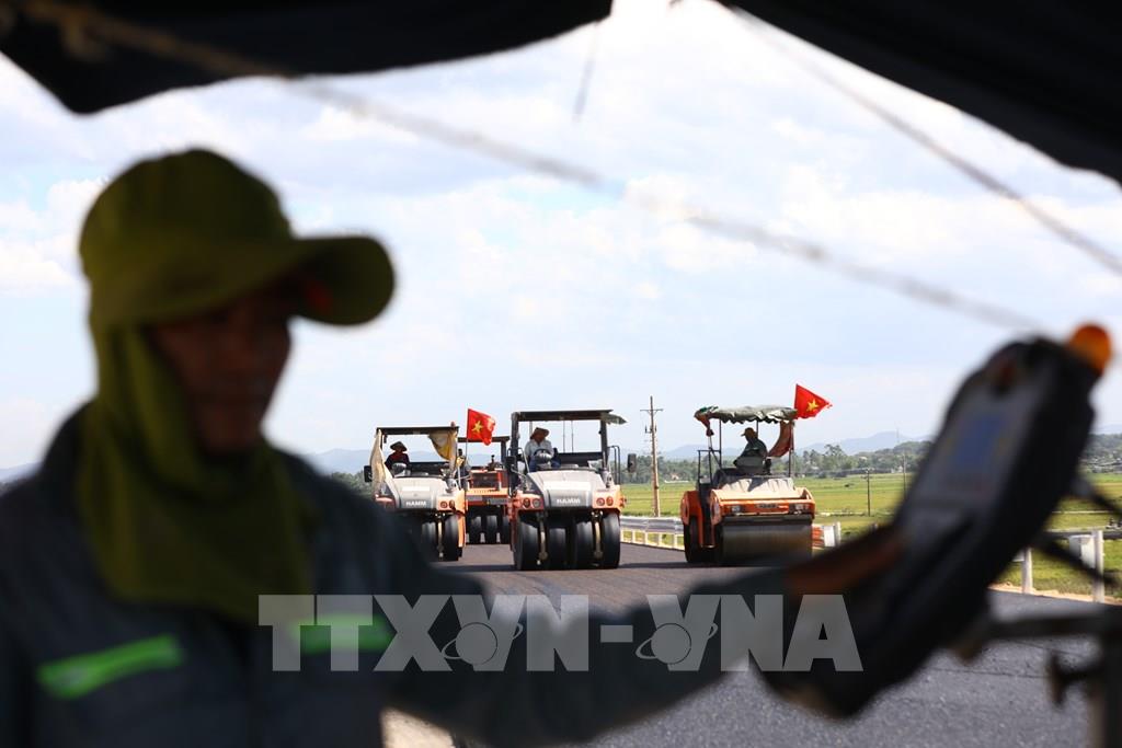 Dưới cái nắng nóng trên 40 độ C, hàng ngàn công nhân của các nhà thầu đang khẩn trương hoàn thiện các km đường cao tốc. Ảnh: Huy Hùng - TTXVN
