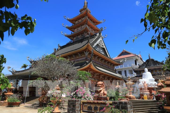 Nét riêng của chùa Bửu Minh là chỉ có một đòn dông duy nhất, với một mái trước và một mái sau dốc đến 45 độ, tạo dáng cao vút và thanh thoát như mái nhà rông Tây Nguyên. Ảnh: Thành Đạt - TTXVN