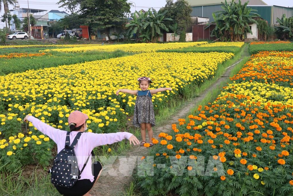 Người dân các nơi đến check in tại cánh đồng hoa Tân Ba ở thành phố Tân Uyên, tỉnh Bình Dương. Ảnh: Dương Chí Tưởng-TTXVN