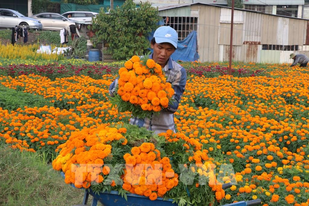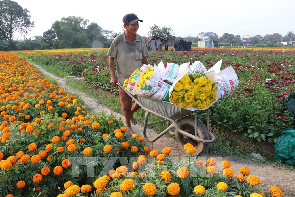 Nhà nông tại cánh đồng hoa Tân Ba ở thành phố Tân Uyên, tỉnh Bình Dương tất bật chở hoa phục vụ thị trường. Ảnh: Dương Chí Tưởng-TTXVN