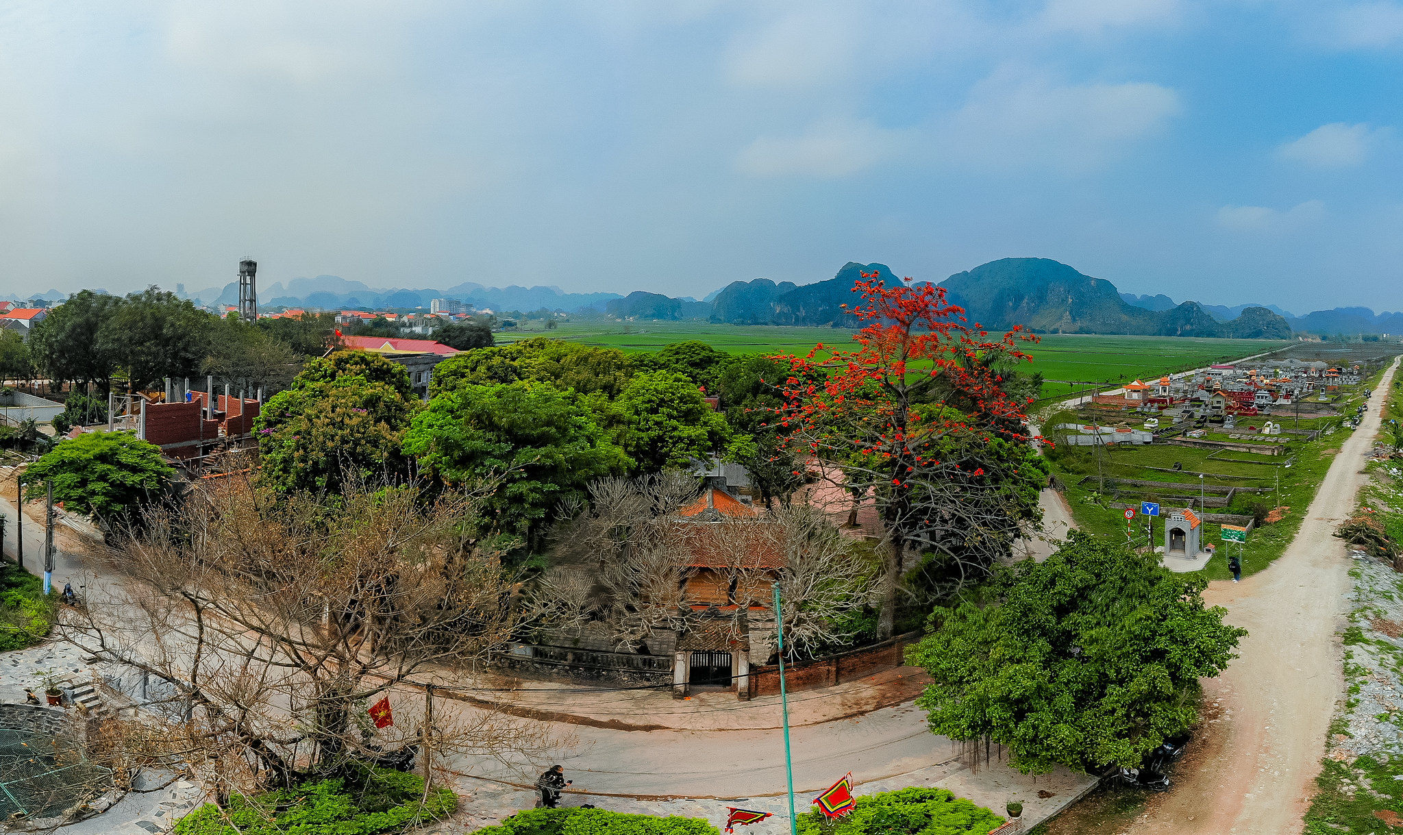 Về huyện Yên Mô mùa này, du khách được ngắm những cây gạo đang nở đỏ rực tạo nên vẻ đẹp thơ mộng, yên bình. Ảnh: Phạm Tuấn Anh - TTXVN