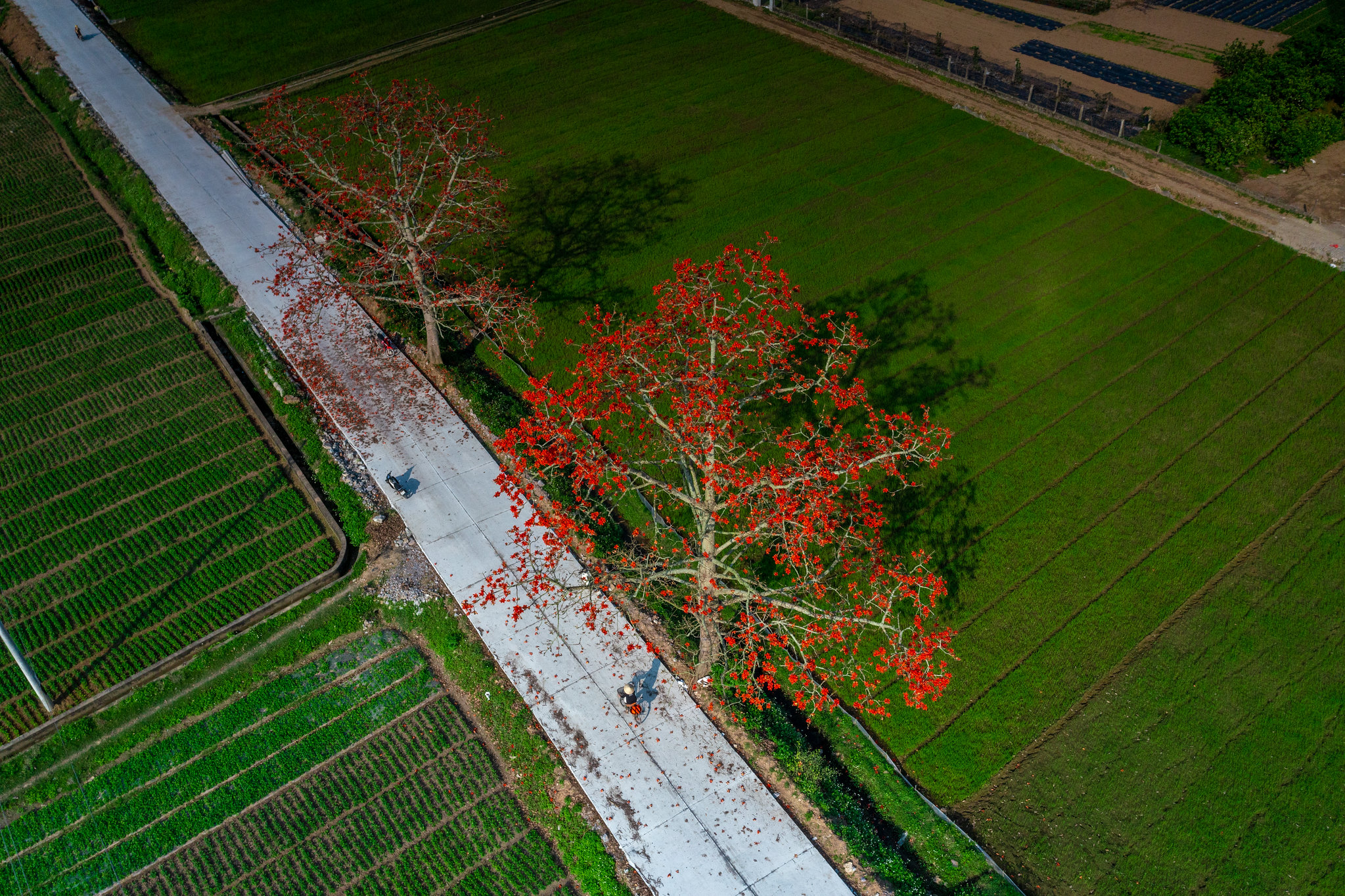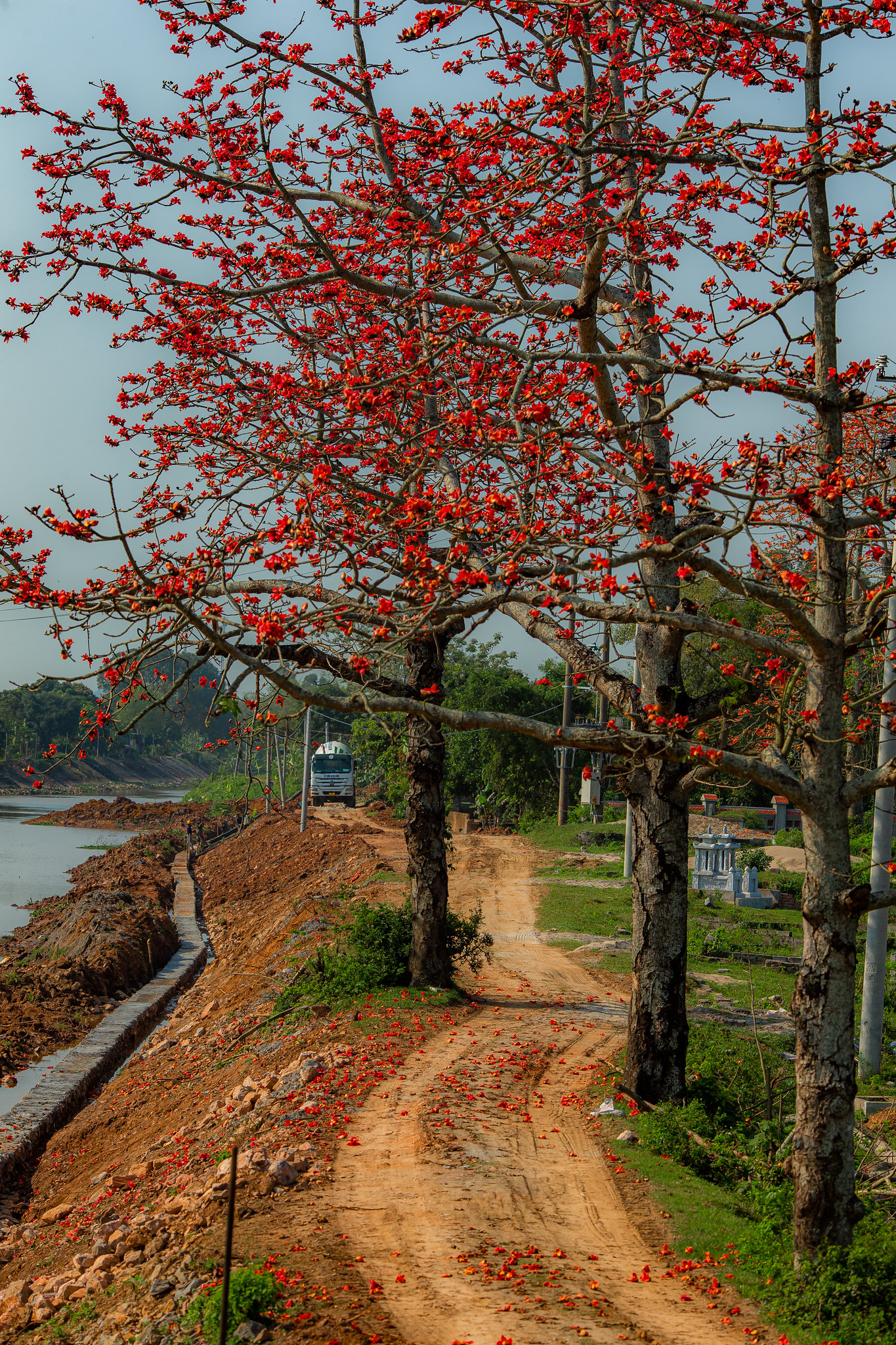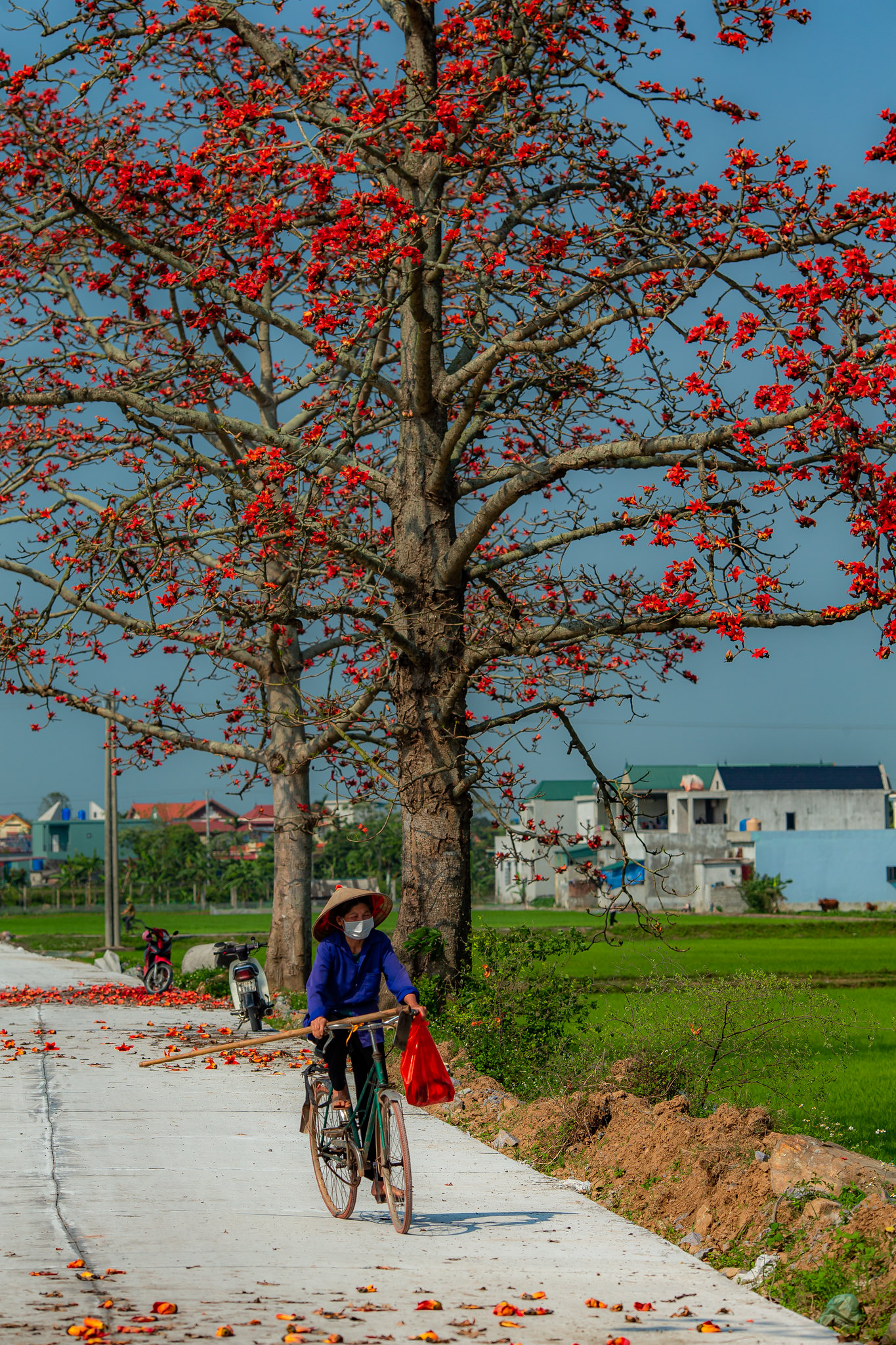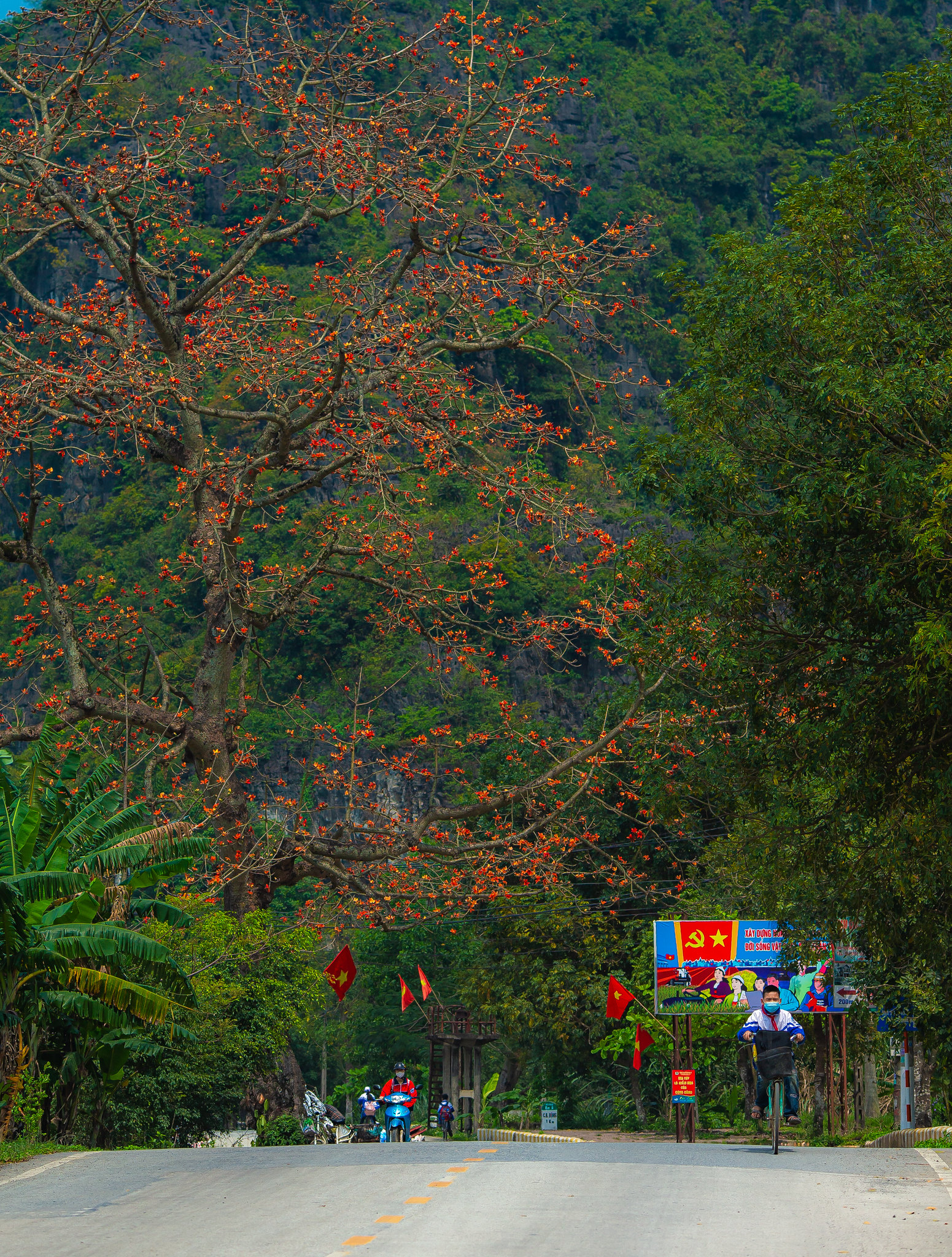 Hoa gạo nở đỏ rực rỡ một con đường tại Huyện Yên Mô, Ninh Bình. Ảnh: Phạm Tuấn Anh - TTXVN