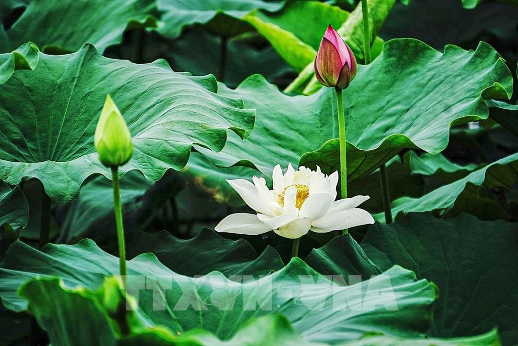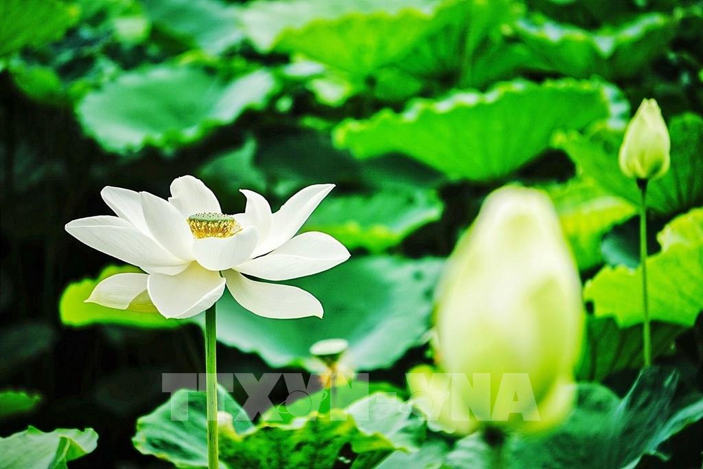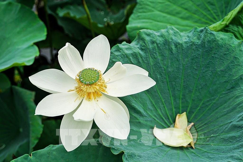 Vẻ đẹp thuần khiết của những bông sen trắng trong đầm sen ở phố Trịnh Công Sơn (quận Tây Hồ, Hà Nội). Ảnh: Khánh Hoà - TTXVN