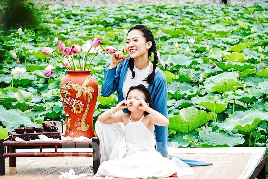 Khoảnh khắc dễ thương của hai mẹ con bên những bông sen nở sớm ở Hồ Tây (Hà Nội). Ảnh: Khánh Hoà - TTXVN