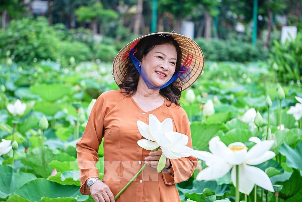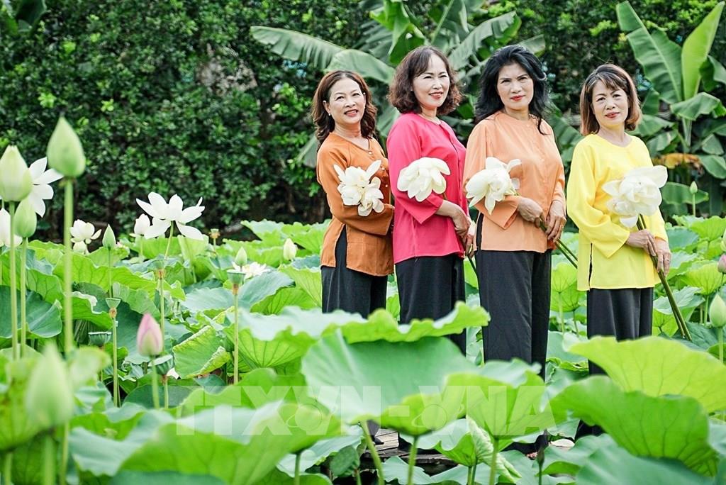 Nhiều phụ nữ trung niên tìm đến đầm sen để lưu lại những khoảnh khắc đẹp cùng bạn bè. Ảnh: Khánh Hoà - TTXVN