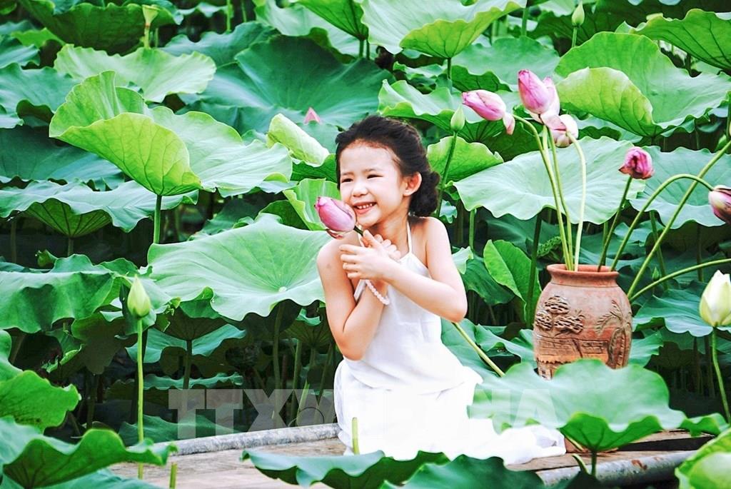 Bạn nhỏ thích thú bên những đoá sen ở đầm sen Hồ Tây (Hà Nội). Ảnh: Khánh Hoà - TTXVN
