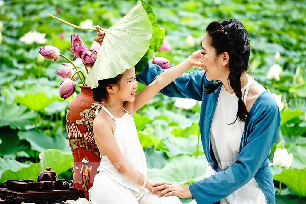 Hai mẹ con bên đầm sen nở sớm ở Hồ Tây (Hà Nội). Ảnh: Khánh Hoà - TTXVN