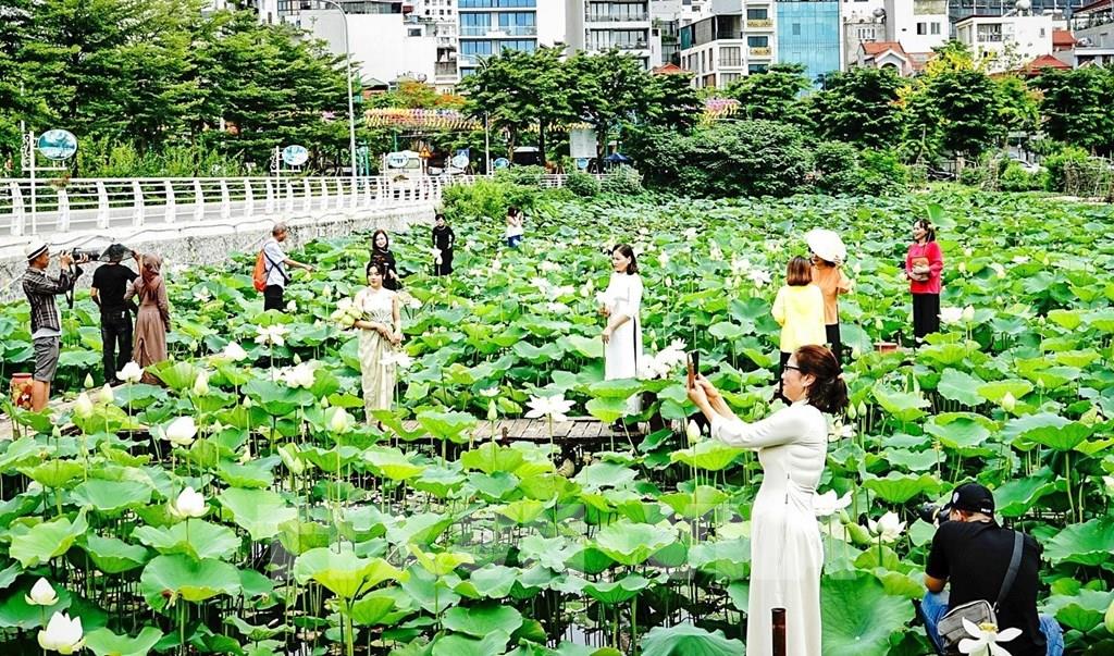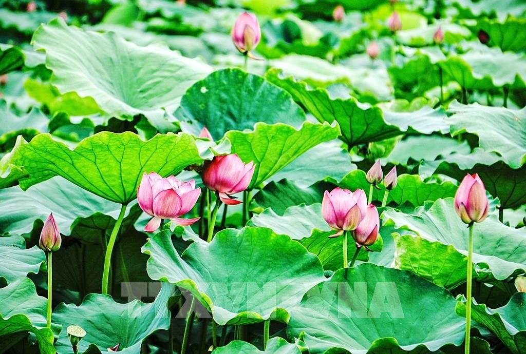 Rất đông du khách lưu lại kỷ niệm bên những đóa sen nở sớm cuối tháng 5. Ảnh: Khánh Hoà - TTXVN
