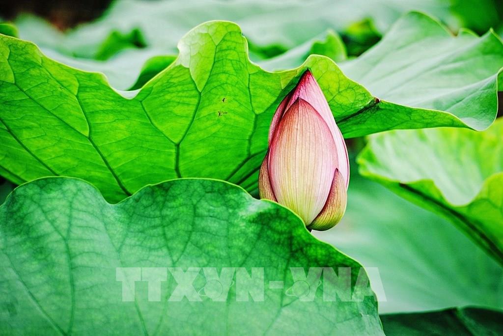 Nụ sen hồng e lệ nấp dưới tán lá. Ảnh: Khánh Hoà - TTXVN