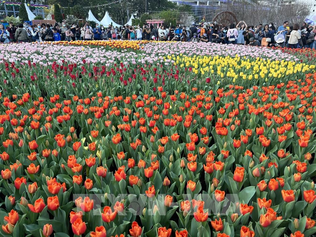 Biển hoa tuylip thu hút đông người dân tham quan và chụp ảnh. Ảnh: Mạc Luyện - TTXVN
