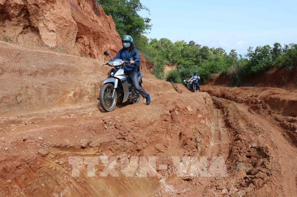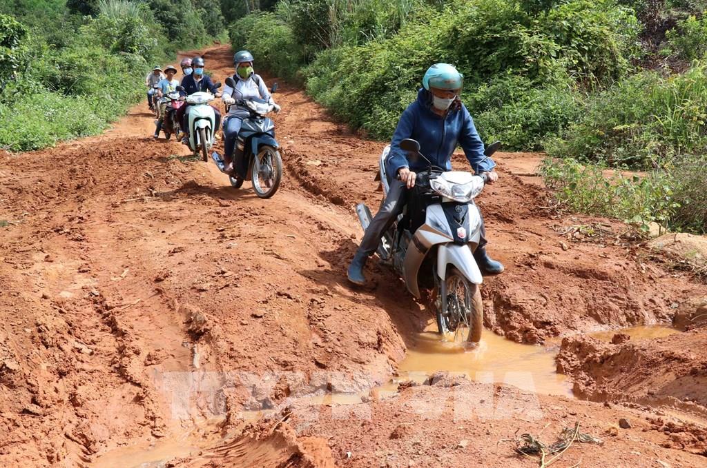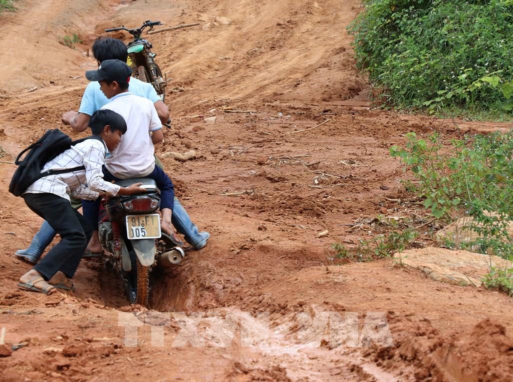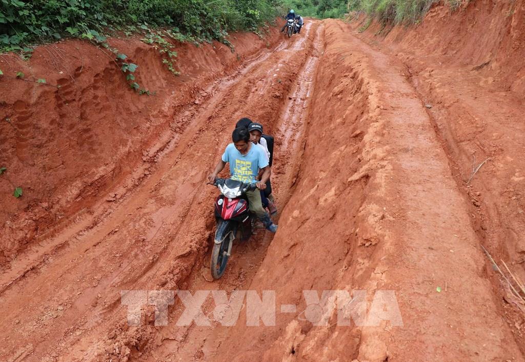 Để có thể ngồi dạy chữ cho các em, giáo viên phải vượt qua những đoạn đường khó khăn, vất vả đến trường. Ảnh: Hồng Điệp - TTXVN