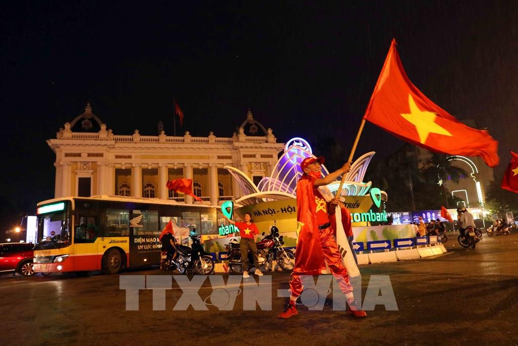 Người dân Thủ đô từ khắp mọi nơi đổ về khu vực trung tâm ăn mừng chiến thắng của U23 Việt Nam. Ảnh: Hoàng Hiếu - TTXVN