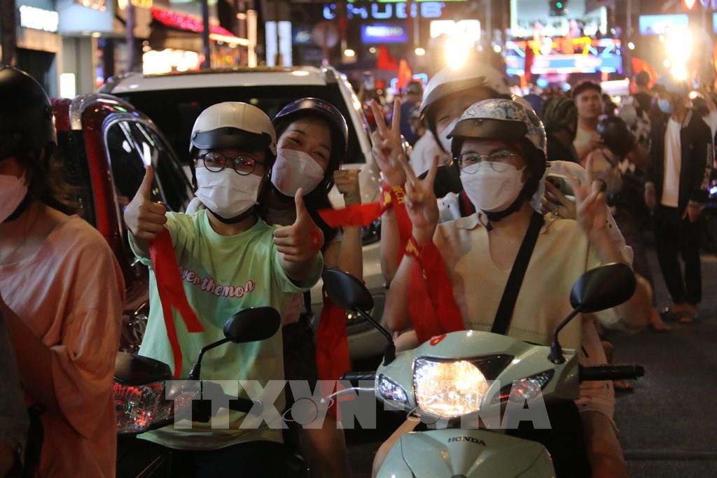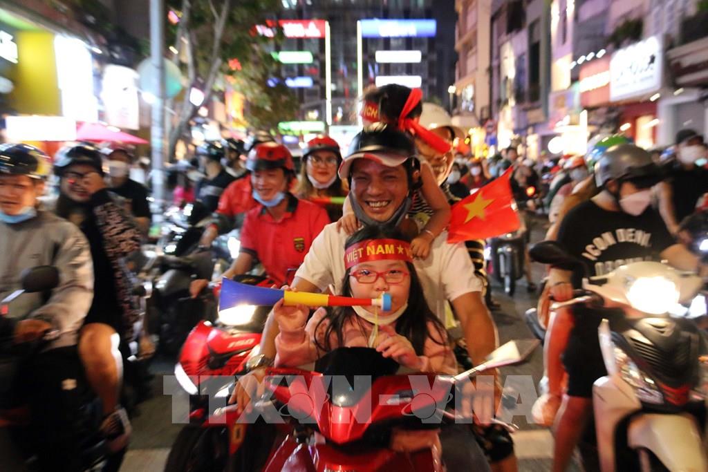 Hàng chục ngàn cổ động viên Thành phố Hồ Chí Minh dồn về các tuyến đường khu vực trung tâm Thành phố diễu hành với rực rỡ cờ đỏ sao vàng, kèn, loa… tạo nên không khí vui tươi phấn khởi. Ảnh: Thanh Vũ - TTXVN