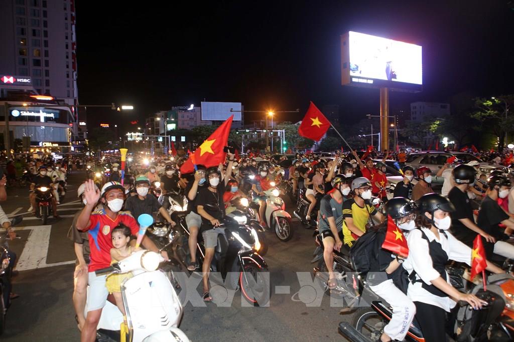 Người dân Đà Nẵng đổ ra đường ăn mừng chiến thắng của đội U23 Việt Nam. Ảnh: TTXVN
