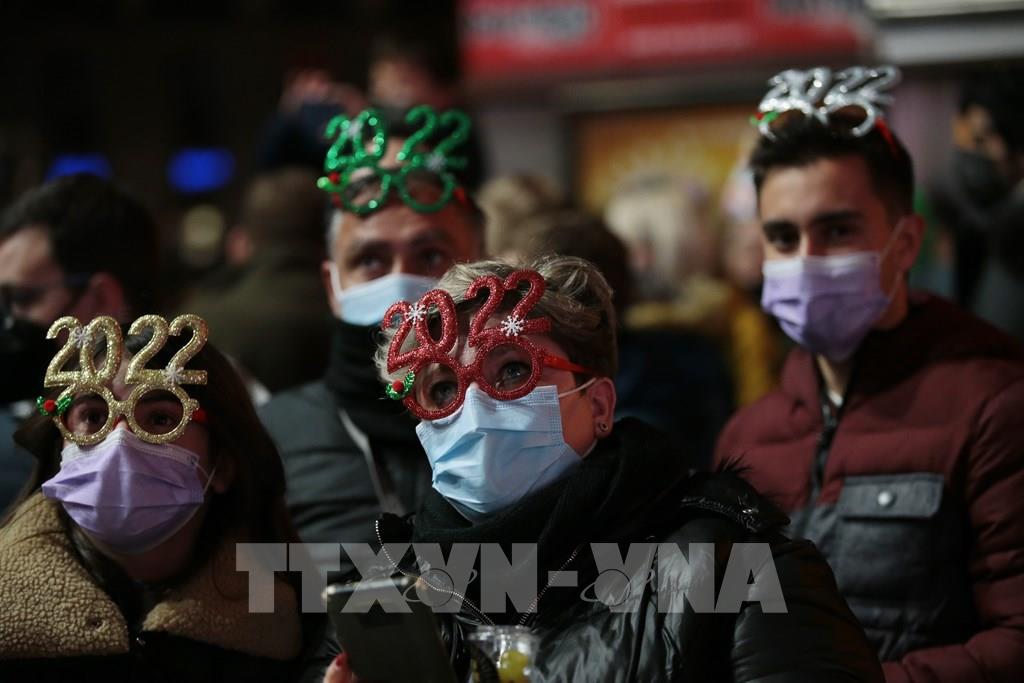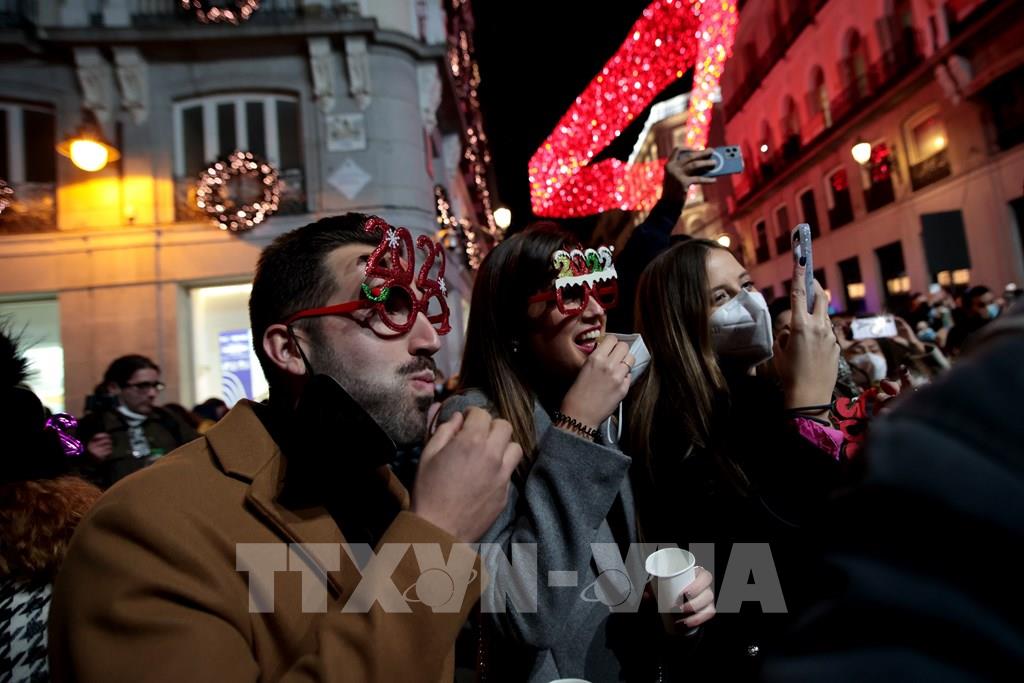 Người dân chờ đợi thời khắc chuyển giao sang Năm mới 2022 tại quảng trường ở Madrid, Tây Ban Nha đêm 31/12/2021. Ảnh: THX/TTXVN