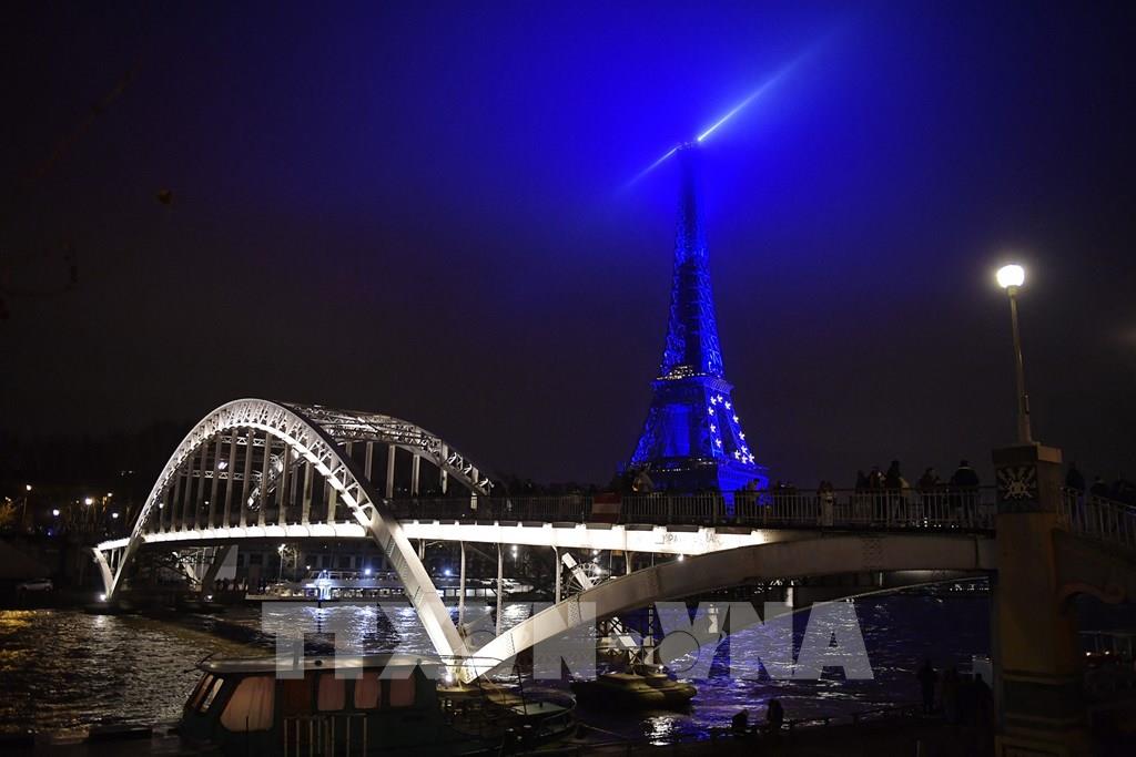 Tháp Eiffel được nhuộm sắc xanh, đánh dấu thời điểm Pháp trở thành Chủ tịch luân phiên Liên minh châu Âu trong Năm mới 2022 tại Paris, ngày 31/12/2021. Ảnh: AFP/TTXVN