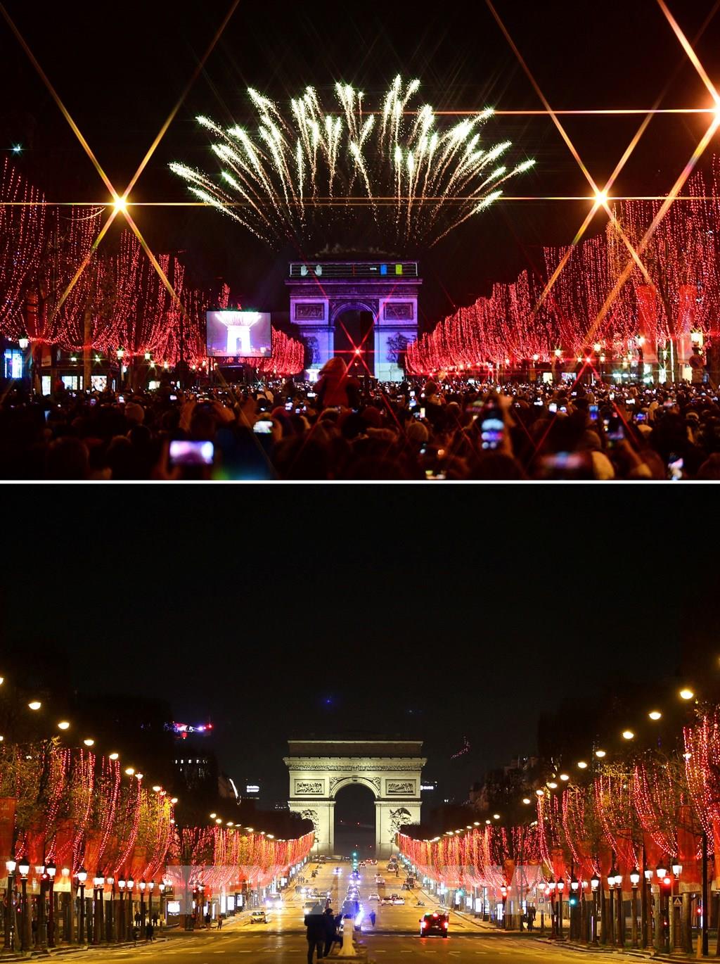 Hình ảnh thủ đô Paris, Pháp đón Năm mới 2020 (ảnh trên) với màn pháo hoa rực rỡ và Năm mới 2022 (ảnh dưới) trầm lắng hơn trên Đại lộ Điện Elysees, ngày 31/12/2020. Ảnh: AFP/TTXVN