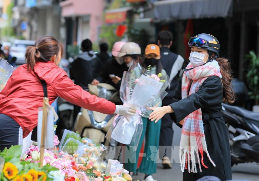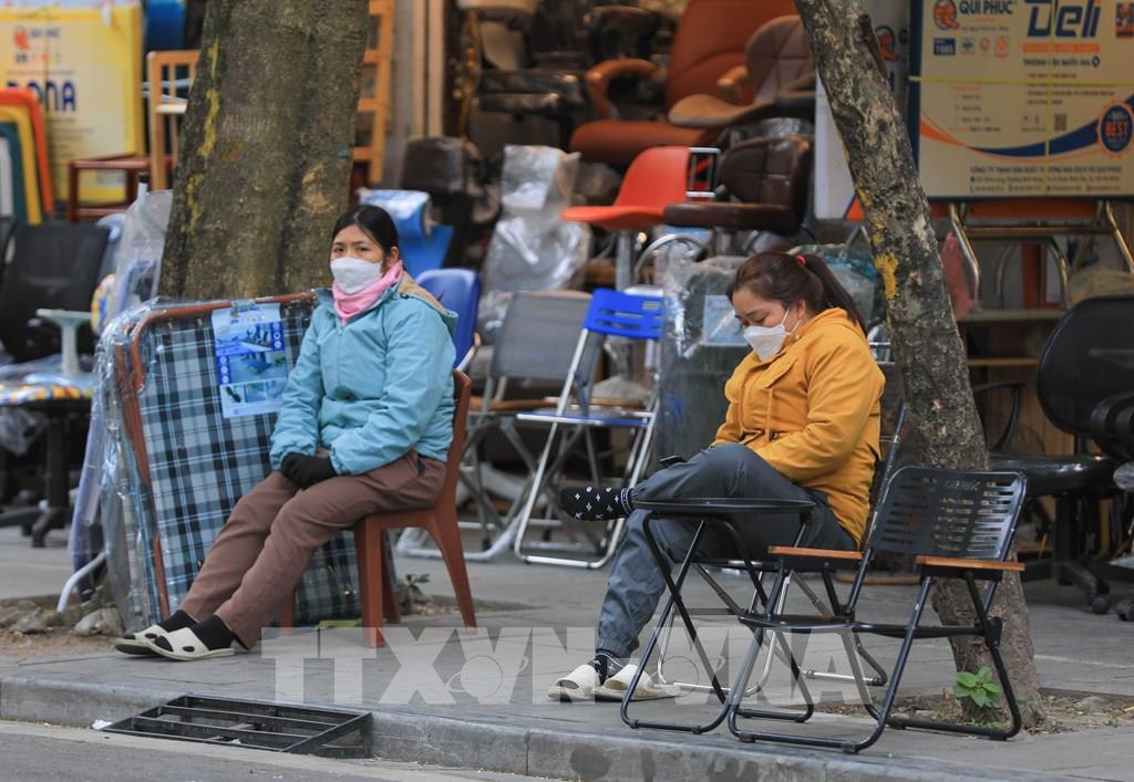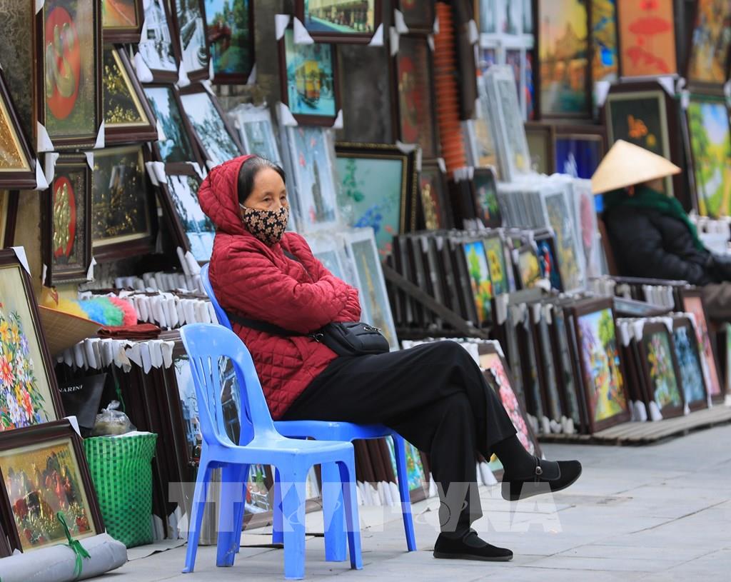 Người bán hàng trên phố Hàm Long co ro giữa trời rét đậm. Ảnh: Hoàng Hiếu - TTXVN