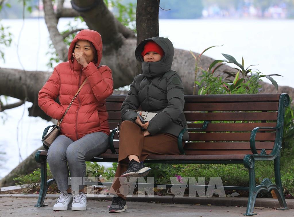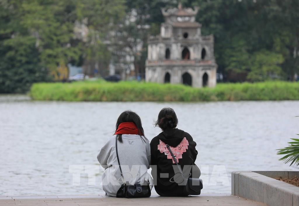 Đôi bạn trải nghiệm gió mùa Đông Bắc bên hồ Hoàn Kiếm. Ảnh: Hoàng Hiếu - TTXVN