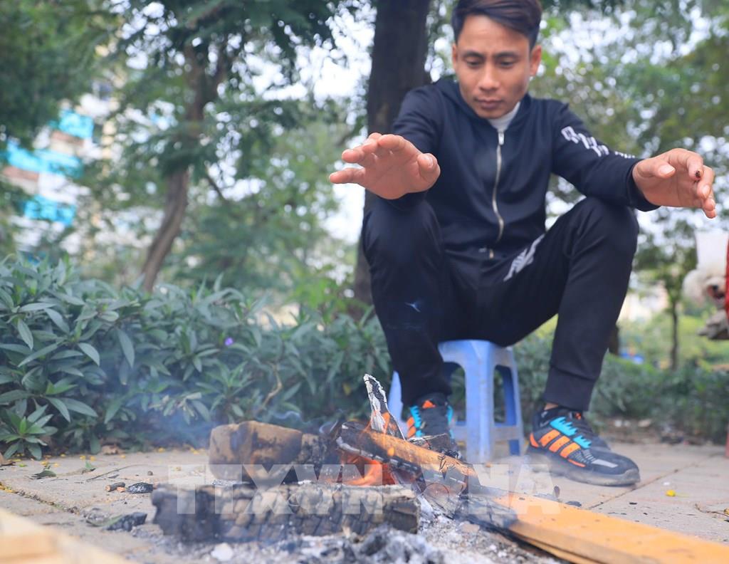 Nhiệt độ giảm sâu khiến nhiều người dân Thủ đô phải đốt lửa sưởi ấm, chống rét. Ảnh: Hoàng Hiếu - TTXVN