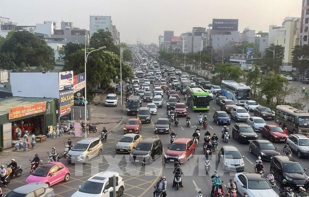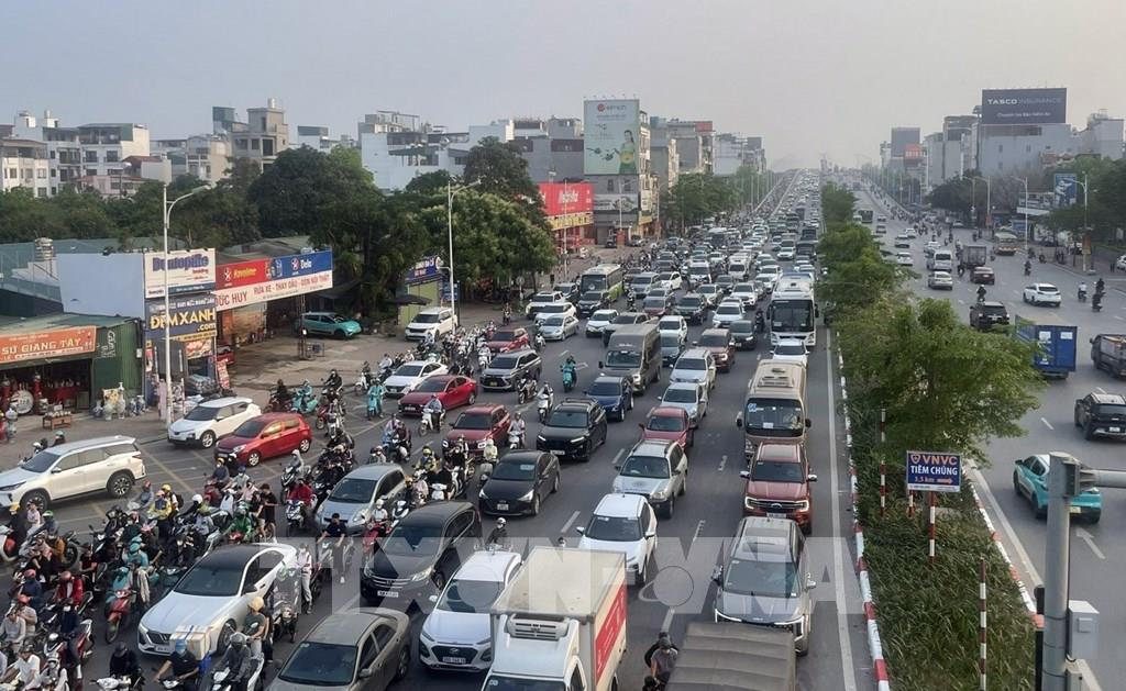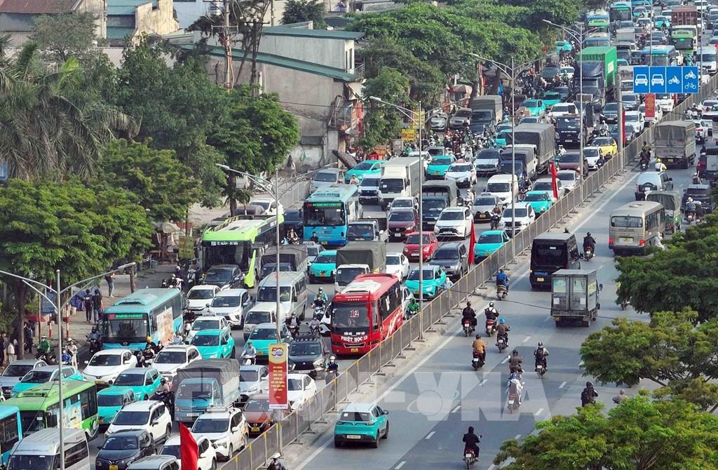 Lượng phương tiện tăng cao đột biến khiến xuất hiện tình trạng ùn tắc cục bộ tại tuyến đường Giải Phóng hướng ra khỏi trung tâm Thủ đô. Ảnh: Phạm Kiên - TTXVN