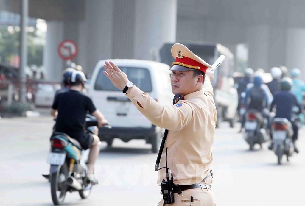 Lực lượng CSGT điều tiết, phân luồng giao thông tại tuyến đường Giải Phóng - Ngọc Hồi. Ảnh: Phạm Kiên - TTXVN