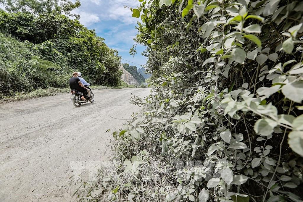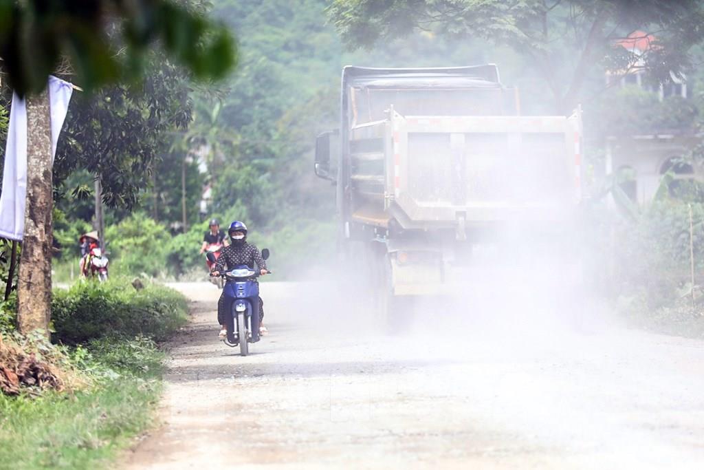 Con đường bạc trắng bụi mà người dân vẫn phải lưu thông mỗi ngày để ra vào xóm Rụt, xã Tân Vinh hoặc đi sang địa bàn xã Cao Răm (Lương Sơn, Hòa Bình). Ảnh: Trọng Đạt - TTXVN