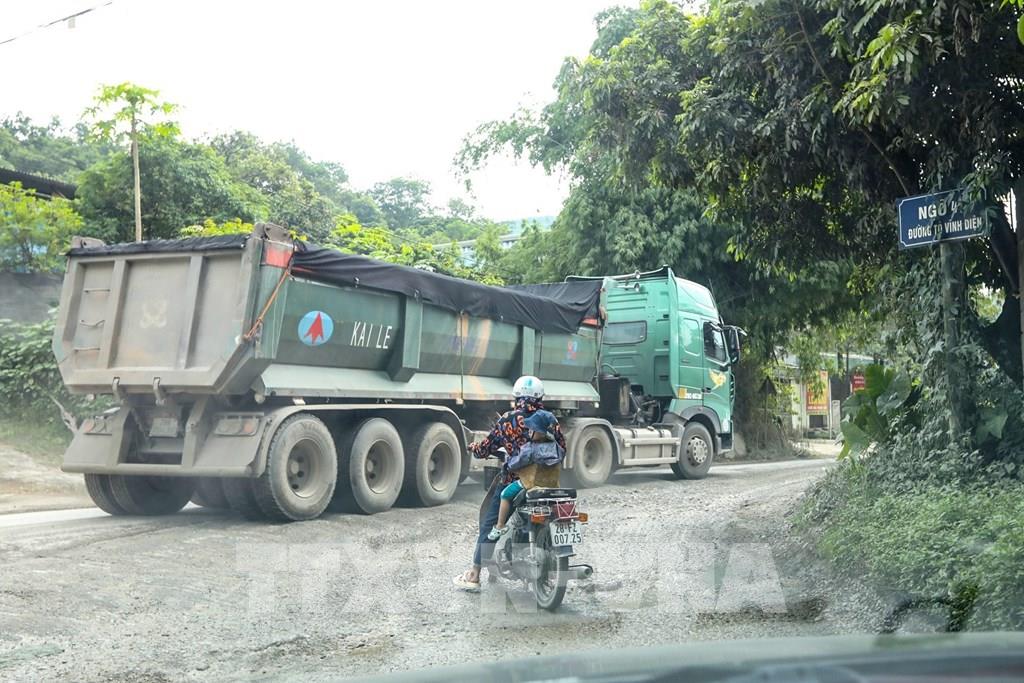 Hình ảnh người dân chật vật lưu thông đầy nguy hiểm trên con đường hư hỏng hoàn toàn bên cạnh những chiếc xe trọng tải quá khổ. Ảnh: Trọng Đạt – TTXVN