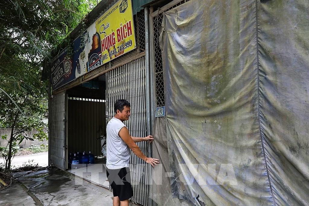 Tấm bạt che chắn bám đầy bụi bẩn mà chủ quán nhậu Hùng Bích có vị trí ngay tại ngã ba ngõ 41 đường Tô Vĩnh Diện đang chằng buộc lại để cho kín hơn. Ảnh: Trọng Đạt – TTXVN