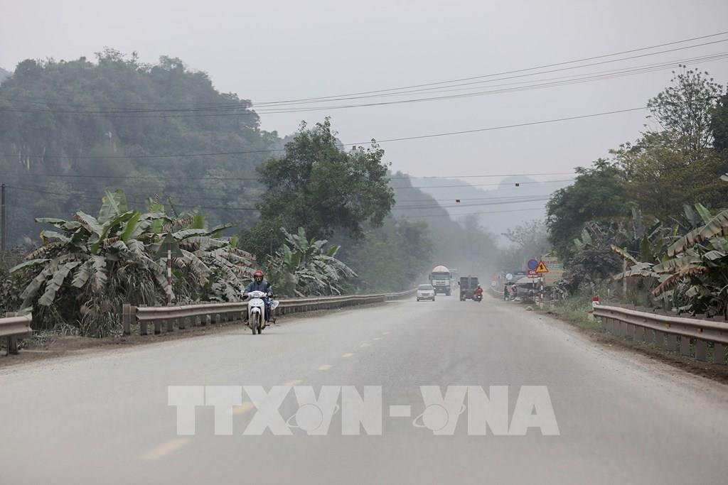 Bụi, khói như màn sương, cây lá hai bên đường bạc trắng do nổ mìn khai thác, do những chuyến xe vận chuyển đất đá ra vào tại các mỏ trên đường Hồ Chí Minh đoạn qua các mỏ đá khu vực xã Cao Dương (Lương Sơn, Hòa Bình). Ảnh: Trọng Đạt - TTXVN
