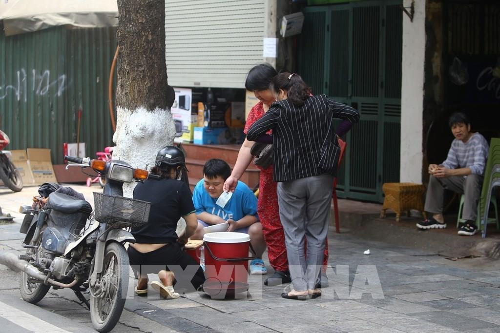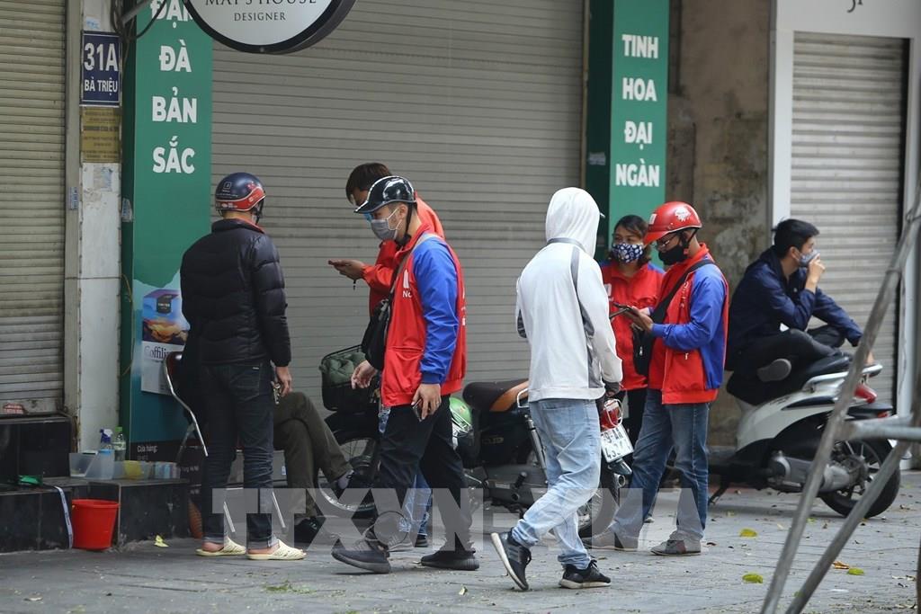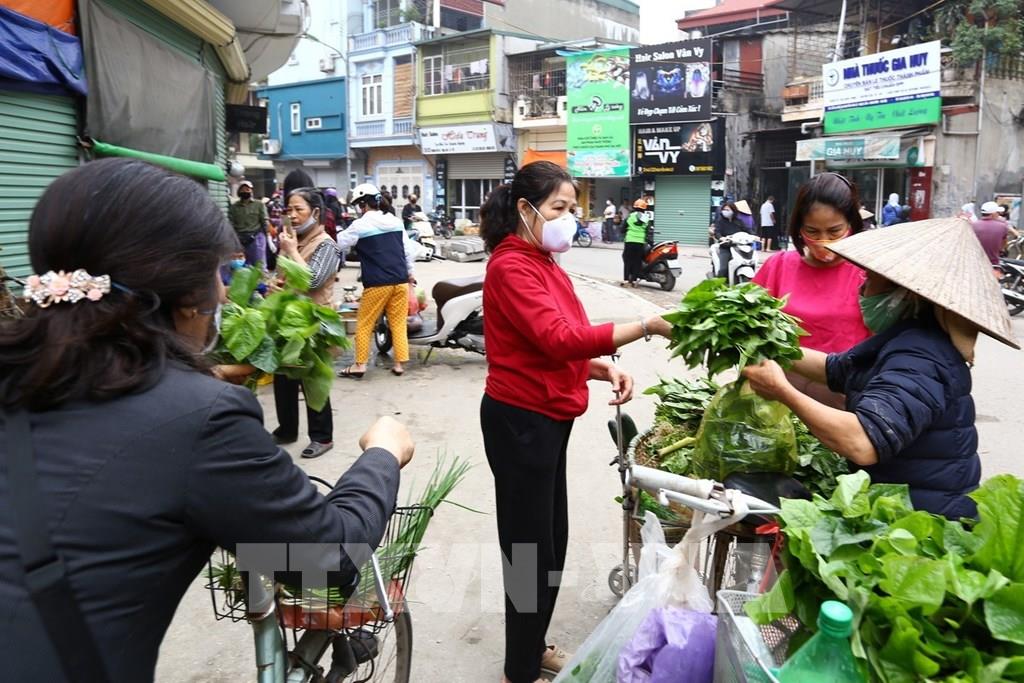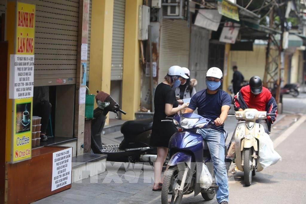 Một số hàng quán bắt đầu mở bán, nên đã có khách tập trung đến mua hàng. Ảnh: Minh Quyết - TTXVN