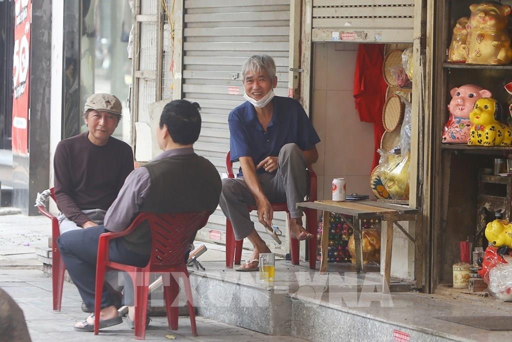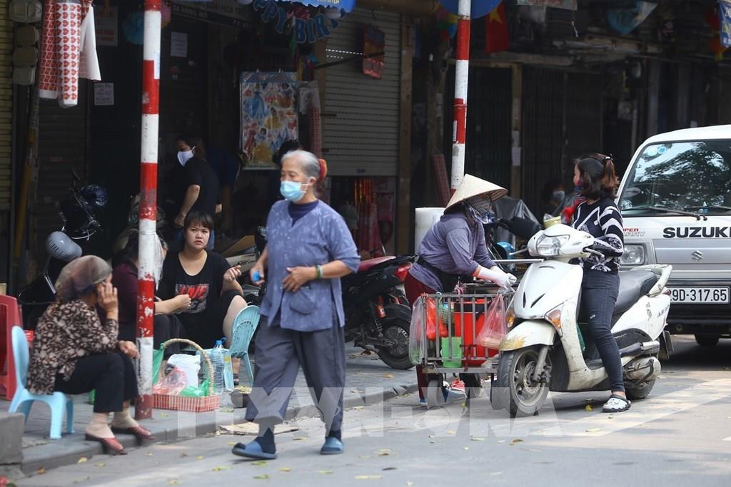 Người dân vẫn tập trung đông trên vỉa hè ở một số tuyến phố có cửa hàng, chưa thực hiện nghiêm theo quy định. Ảnh: Minh Quyết – TTXVN