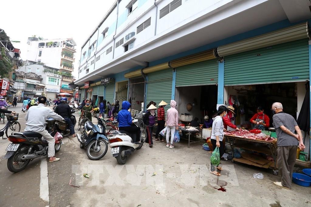 Các quầy hàng tại chợ Gia Lâm (Hà Nội), người dân mua bán vẫn chưa đảm bảo về khoảng cách 2m theo quy định. Ảnh: Minh Quyết – TTXVN