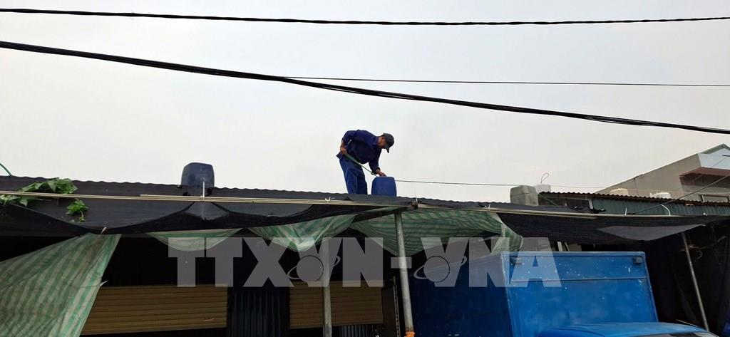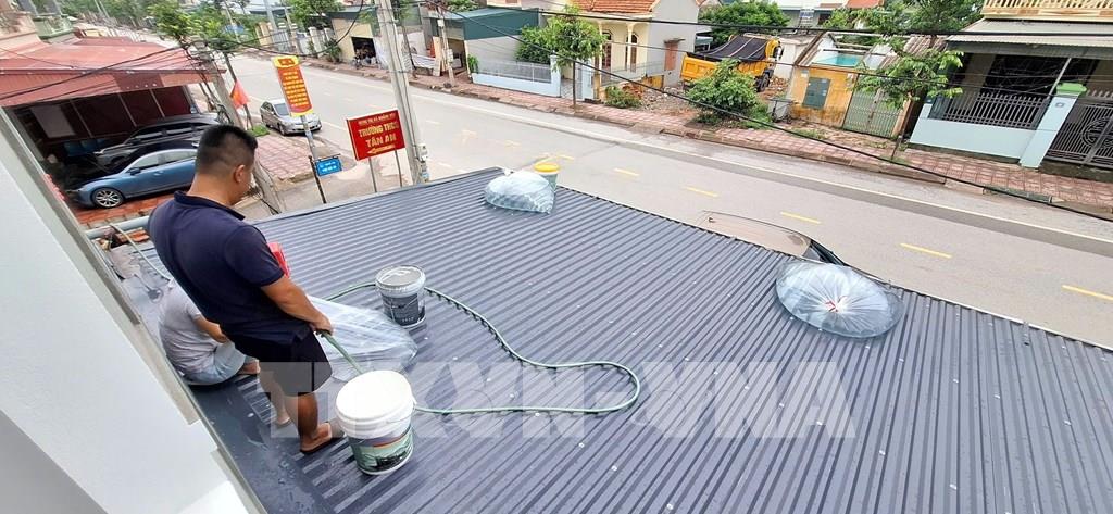 Người dân phường Hà An, tỉnh Quảng Ninh dùng các bao nước để gia cố mái tôn. Ảnh: Đức Hiếu - TTXVN