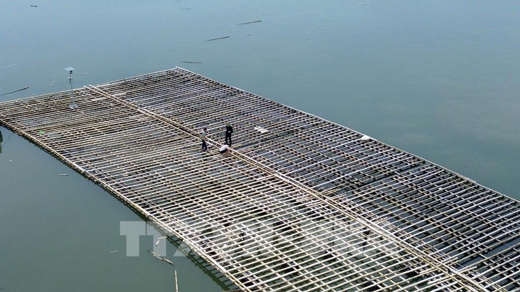 Người dân phường Hà An, tỉnh Quảng Ninh kiểm tra và gia cố lại bè nuôi hải sản. Ảnh: Đức Hiếu - TTXVN