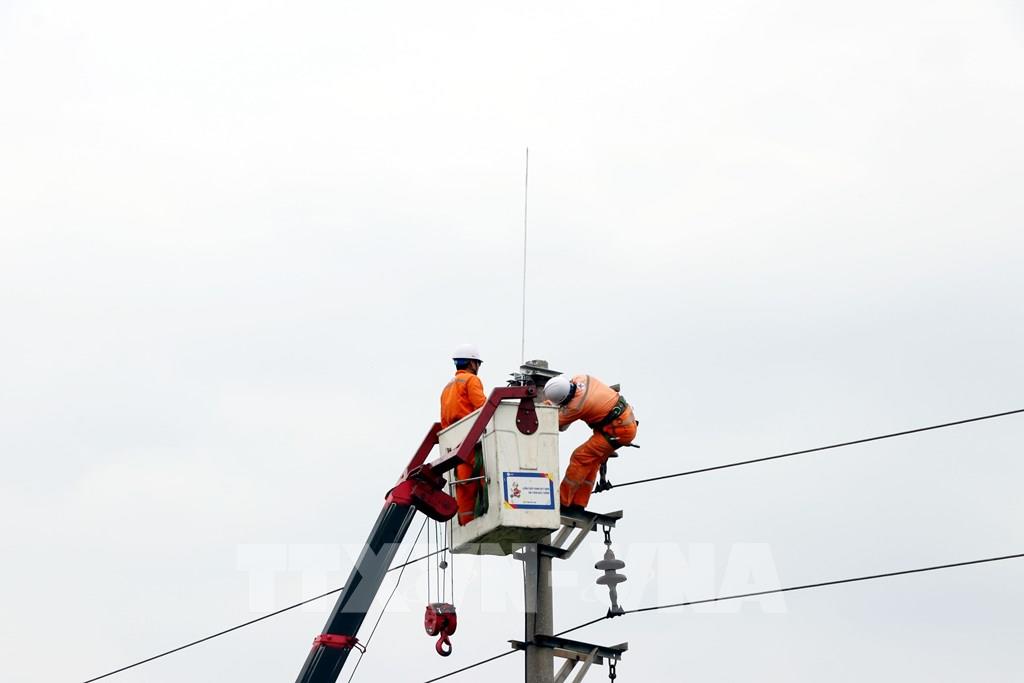 Đội quản lý điện khu vực Hải Dương (Công ty Điện lực Hải Phòng) lắp đặt thiết bị chống sét cho hệ thống cột và dây điện. Ảnh: Mạnh Tú - TTXVN