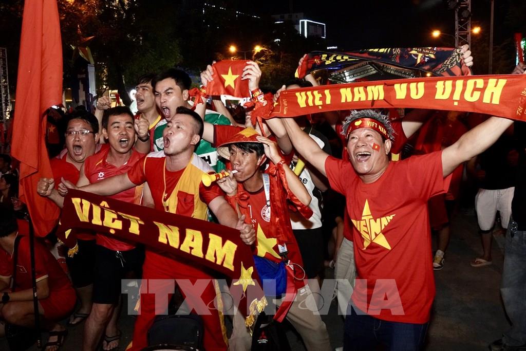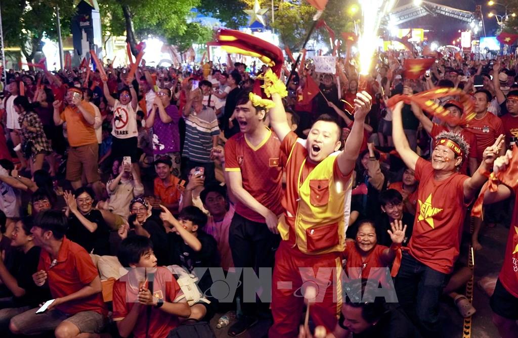 Người hâm mộ tại Tp Hồ Chí Minh ăn mừng chiến thắng sau khi trọng tài thổi còi kết thúc trận đấu. Ảnh: Trung Tuyến – TTXVN