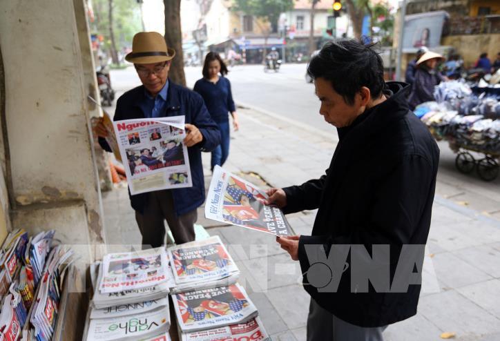Người dân thủ đô Hà Nội đọc thông tin tại sạp báo của Thông tấn xã Việt Nam sáng 28/2/2018, để theo dõi sự kiện Hội nghị Thượng đỉnh Mỹ - Triều Tiên lần thứ hai. Ảnh: Danh Lam – TTXVN