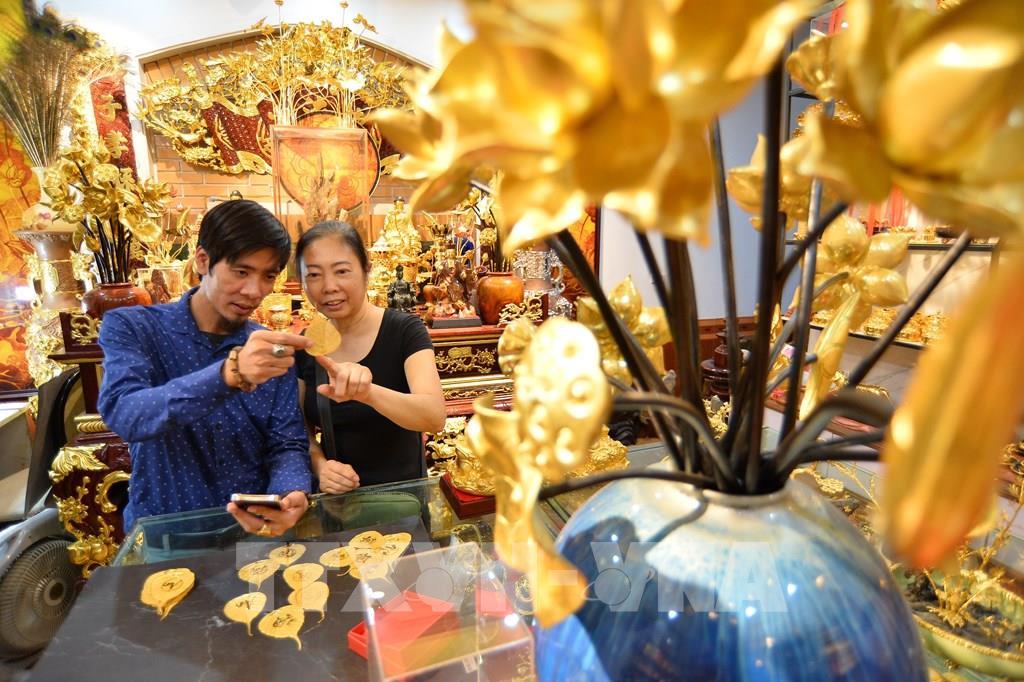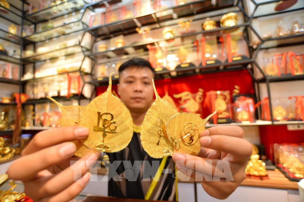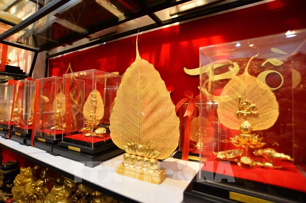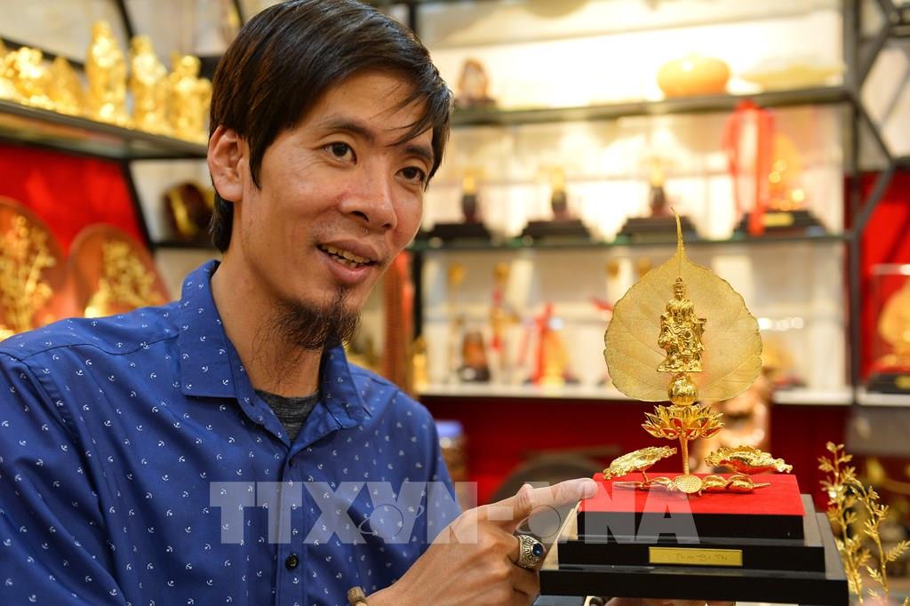 Nguyễn Đức Bằng là nghệ nhân đầu tiên và duy nhất mạ vàng 24k trên lá bồ đề. Từ thành công trong việc mạ vàng lá bồ đề, nghệ nhân Nguyễn Đức Bằng còn phát triển rộng hơn, gắn thêm nhiều hình tượng, nâng cao giá trị nghệ thuật. Ảnh: Minh Đức – TTXVN