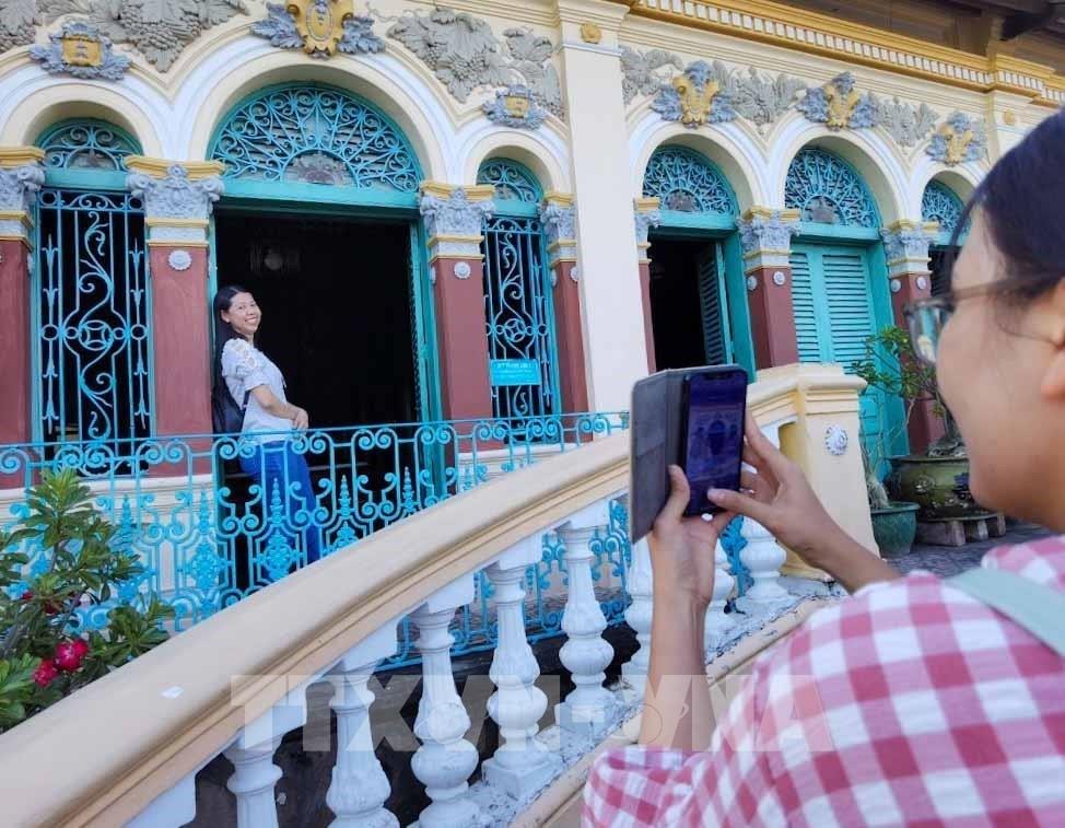 Du khách đến thăm nhà cổ Bình Thủy không quên ghi lại những khoảnh khắc đẹp. Ảnh: Thanh Tùng - TTXVN