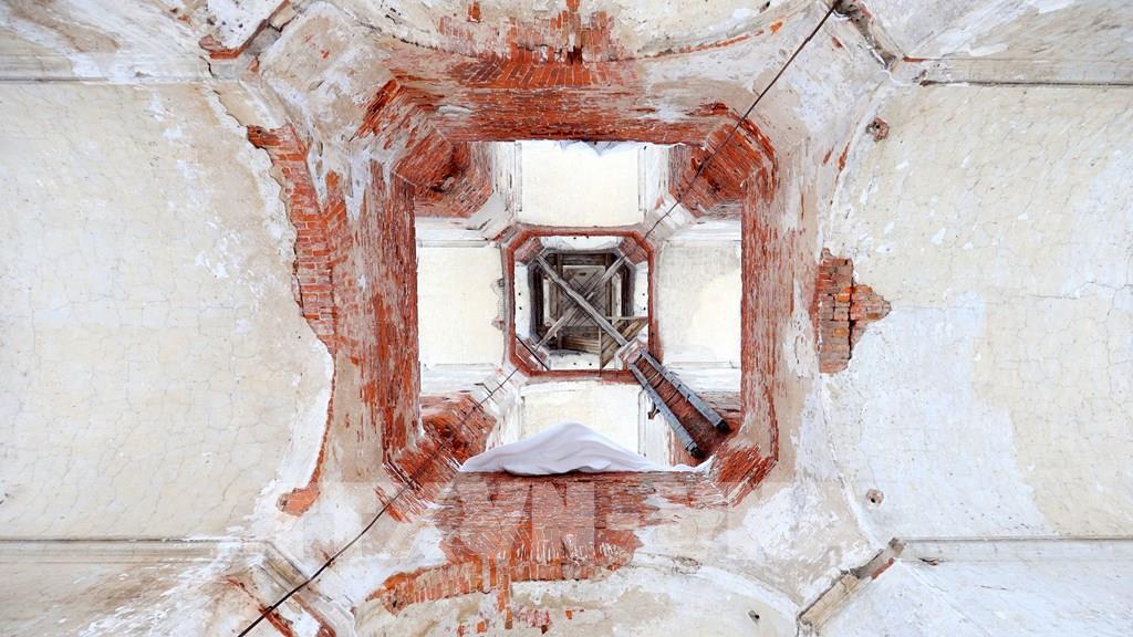 Cấu trúc cân đối bên trong tháp chuông nhà thờ Nikita Muchenika. Tương truyền, tháp chuông được xây dựng bởi một kiến trúc sư-nông dân địa phương có tên Alexei Stepanovich Kozlov. Ảnh: Trần Hiếu - PV TTXVN
