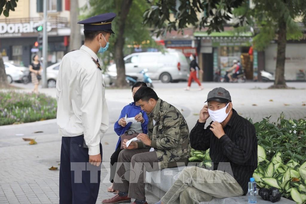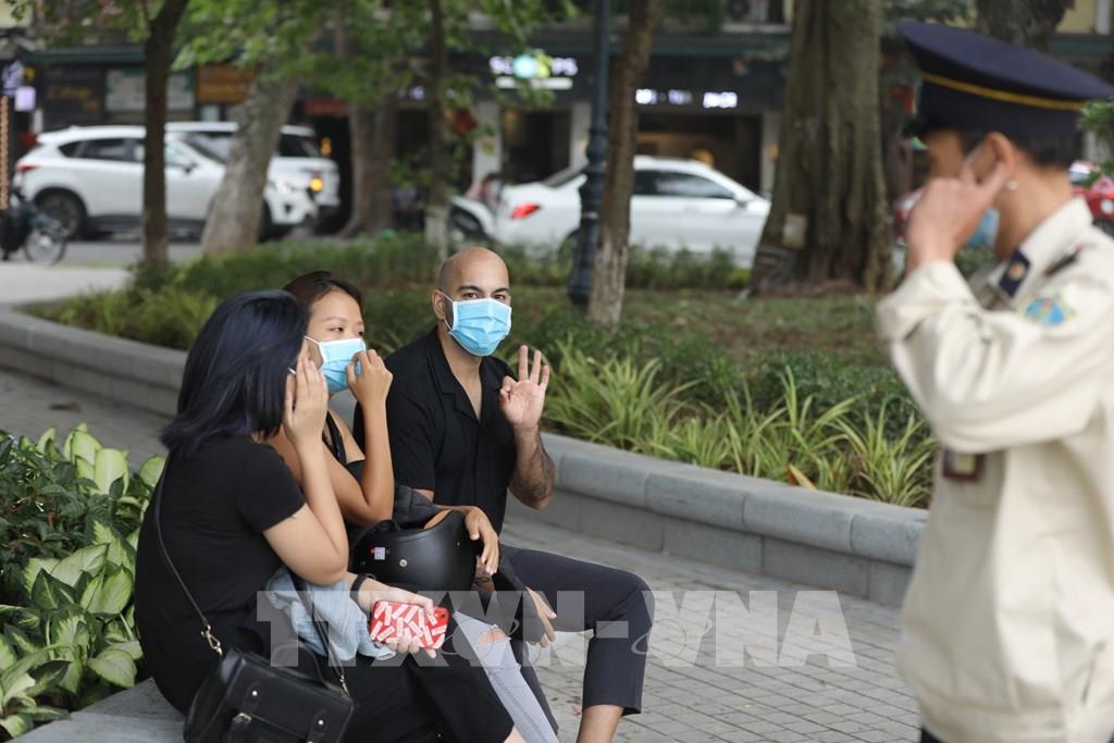 Nhân viên Ban quản lý khu vực hồ Hoàn Kiếm nhắc nhở người dân đeo khẩu trang nơi công cộng. Ảnh: Minh Quyết - TTXVN