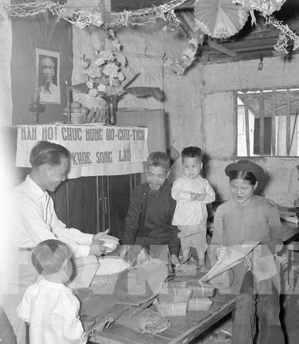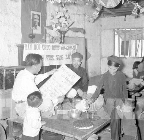 Sáng mùng một Tết, cả gia đình ngồi trước bàn thờ Tổ quốc nghe đọc thư chúc Tết của Chủ tịch Hồ Chí Minh. Ảnh: TTXVN
